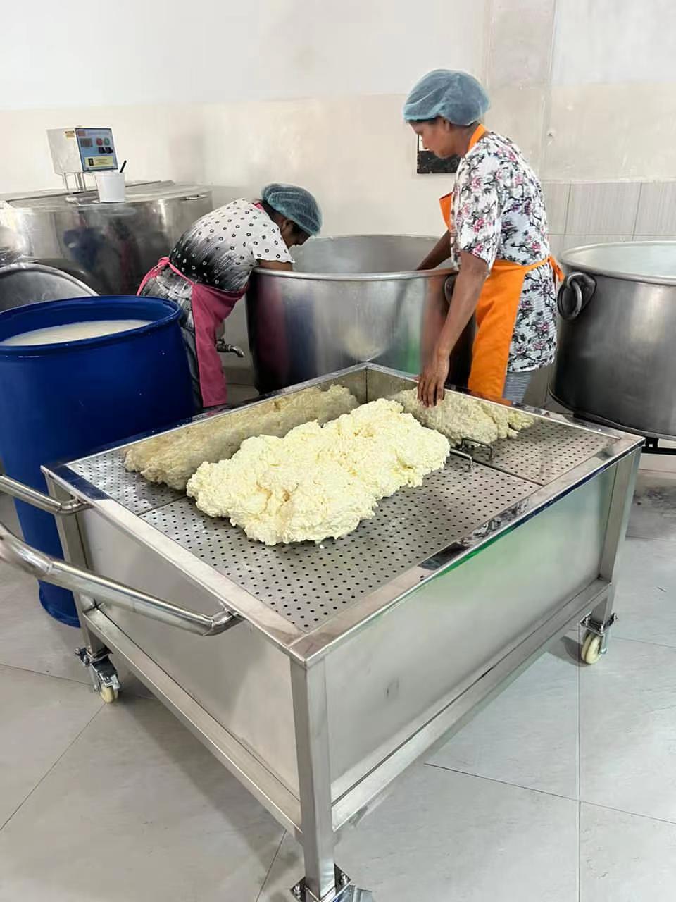 Дренажный стол — это оборудование из нержавеющей стали, предназначенное для удаления излишков сыворотки из сырного сгустка. Он используется в процессе формирования сырной массы перед прессованием.